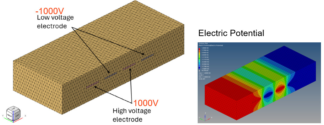 Elektrostatik analiz 2025 versiyonuyla desteklenmektedir ve ANALYSIS ESTAT komutu ile tanımlanabilir. ESTAT, dielektrik bir malzeme içindeki elektrik potansiyel dağılımını bulmak ve yapı üzerindeki elektrostatik kuvveti değerlendirmek için kullanılabilir. Hesaplanan elektrik potansiyel dağılımı ve elektrostatik kuvvet, yapısal analizlerde harici yükleme olarak da kullanılabilir. Kullanabilen malzemeler MAT1PT, MAT2PT