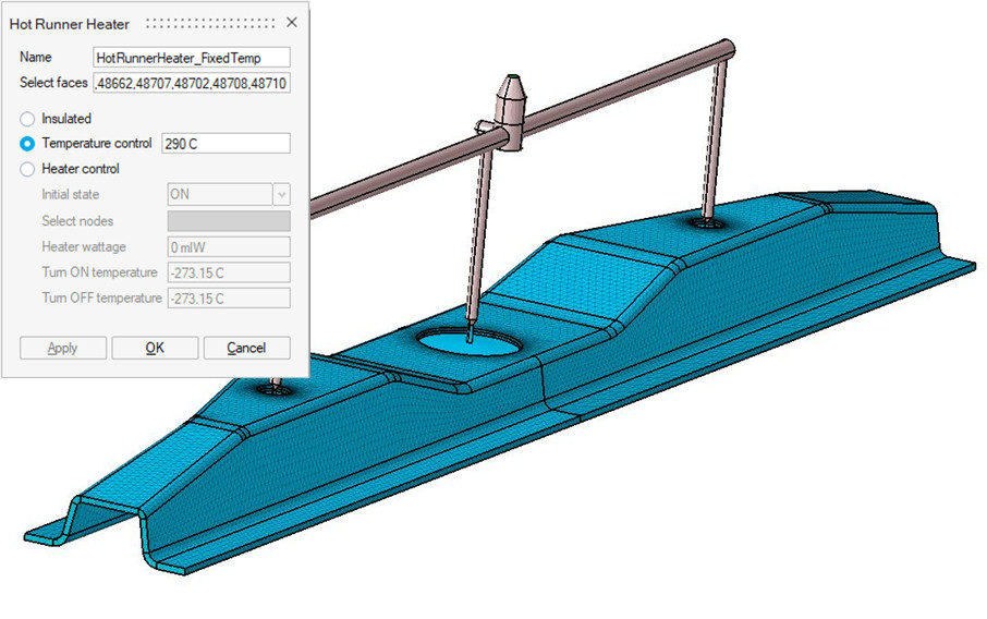 Sıcak yolluk sistemleri, enjeksiyon kalıplama işlemlerinin % 35’inden fazlasında kullanılmaktadır. Plastik enjeksiyon kalıplama çözücü, iki tür sıcak yolluk sisteminin modellemesini destekler: valf pimli(valve gate) ve termal (açık uçlu valf) pimli sistemler. Sıcak yolluk sistemlerini desteklemek için Heater BC adlı yeni bir sınır şartı (BC) tipi eklendi. Bu BC, üç tip ısıtıcı kontrolüne izin vermektedir. Bunlar aşağıdaki gibidir:
