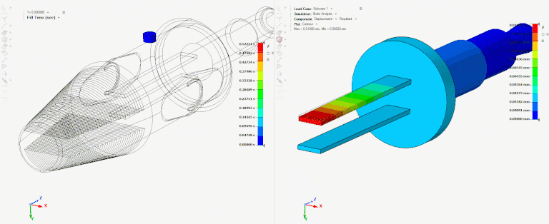 Plastik enjeksiyon işlemi sırasında enjeksiyon kuvvetleri kalıp ekipmanlarını veya insert parçalarını deforme edebilir. Bu nedenle, kalıp boşluğunun dolumu esnasında akışkan ile kalıp/insert parça etkileşiminin analizini doğru bir şekilde gerçekleştirmek ve oluşabilecek deformasyonları öngörmek önemlidir. Plastik enjeksiyon çözücüsü, Altair OptiStruct (Impcilit FEA) ile tek yönlü (one way coupling) bağlantı kurarak, kalıplama esnasında şekil değişikliğine sebep olan gerilme ve sıcaklık değerlerini hesaplamaktadır. Plastik enjeksiyon çözücüsü, elastik bir analizin gerçekleştirilmesi için OptiStruct’ın otomatik olarak çalıştırılması sağlamaktadır. Bu analizleri daha da gelişmiş seviyede gerçekleştirmek için Altair Inspire Mold yerine Altair HyperMesh ya da Altair SimLab kullanılabilir. Katı-akışkan etkileşim analizinin (FSI simulation) otomatik olarak gerçekleştirilebilmesi için yeni bir parametre seçimi eklendi. Bu seçenek etkinleştirildiğinde, plastik enjeksiyon kalıplama çözücüsü otomatik olarak yapısal analizlerin gerçekleştirilmesi için verileri Altair OptiStruct’a aktarır. Böylelikle “core shift” (maça kayması) analizlerinin gerçekleştirilmesi sağlanabilmektedir.
