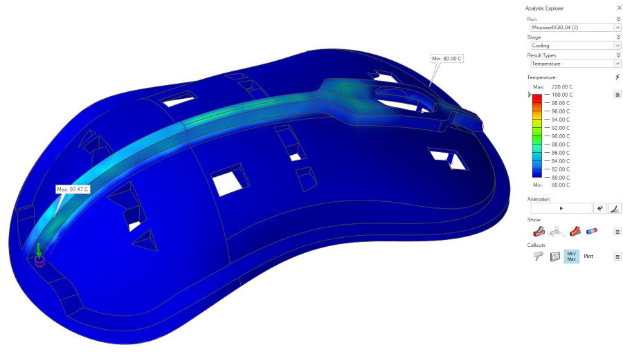 Enjeksiyon kalıplamanın dolum “filling” aşaması için hızlı bir 3D çözücüsü, önceki sürümde tanıtılmıştı. Şimdi, bu hızlı çözüm soğutma “cooling” aşamasına kadar genişletildi. Şimdi hem doldurma hem de soğutma aşamalarını bu 3D çözücü ile desteklenmektedir. Artık çözücünün hesaplama hızı, ara yüzey”mid-surface” analizleriyle karşılaştırılabilmektedir.