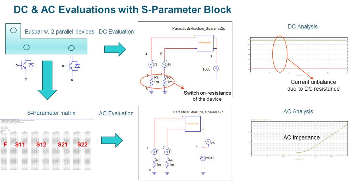 Bir cihazın parazitik parametreleri Altair SimLab‘dan veya ölçümden S-Parametre formatında elde edilebilir ve aşağıdakileri değerlendirmek için devre S-Parametre bloğuyla simüle edilebilir: