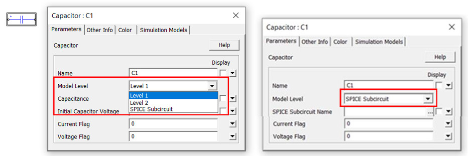 Dirençler, İndüktörler ve Kondansatörler aşağıda gösterildiği gibi “SPICE Subcircuit” adında yeni bir Model Seviyesine sahiptir. Seçildiğinde, kullanıcının modele göz atmasına ve seçmesine izin verecektir. PSIM, SPICE modellerini yapıya okuyacak ve PSIM simülasyonunu çalıştıracaktır.