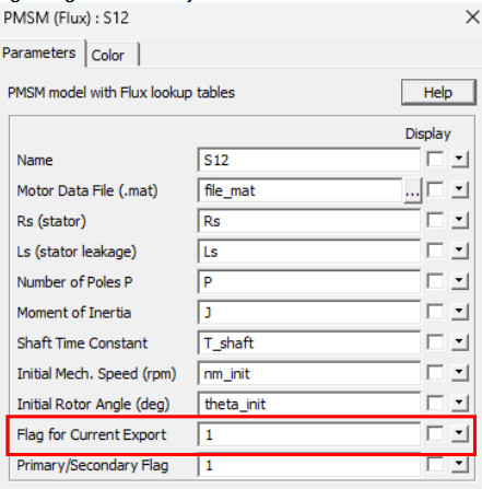 “PMSM (Altair Flux)” ve “PMSM (Altair FluxMotor)” elemanlarına aşağıda gösterildiği gibi yeni bir “Flag for Current Export” parametresi eklenmiştir: