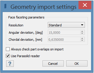 ALTAIR SimSolid 2019.2 versiyonunda CAD dosyasının içeri alınmasında artık parasolid çekirdeği kullanılmaktıdır. Neredeyse tüm durumlarda CAD dosyası daha hızlı ve daha doğru açılmaktadır. Alternatif olarak hala bulunan eski çekirdeğin aksine yüzey parçalarını ( SimSolid sadece 3D katı modelleri desteklemektedir) veya geometri hataları olan solid parçaları içeri almayacaktır. Bu durumda model içeri alınırken atlanan bu parçaların bir listesi ekranda yer almaktadır. Mevcut versiyonda STEP, CGR ve 3DXML formatları için PARASOLID çekirdeği desteği bulunmamaktadır. Bu dosya türleri için, alternatif eski CAD okuyucusu otomatik olarak devreye girmektedir.