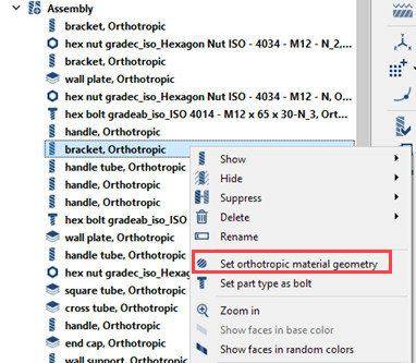 Proje ağacındaki “Assembly” bölümünde seçilen bir parça için bağlam menüsünde ortotropik malzeme oryantasyonunu tanımlayabilirsiniz.