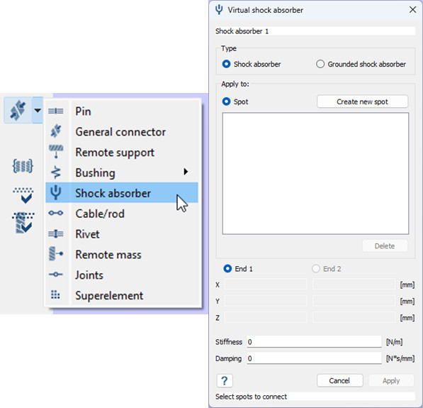 2024 versiyonuna yeni bir sanal bağlantı türü olan amortisör eklendi. Sanal amortisör bağlantısı, uzunluğu boyunca sertlik ve sönümleme ile tanımlanır. Sanal amortisör bağlantısı uzunluğu boyunca sertlik ve sönümleme değerleri ile tanımlanır. Bu özellik, amortisörleri içeren dinamik sistemlerin simülasyonunu geliştirir ve çeşitli koşullar altında davranışlarını daha doğru bir şekilde analiz etmeyi sağlar.