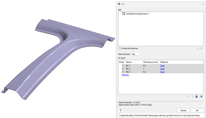 SimSolid 2024, kompozit yapıların analizine imkan sağlamaktadır. Yazılımda açılan yüzeylerin katmanlı kompozitlere dönüştürülmesini desteklenmektedir. Bu yüzey, katı modelin orta yüzeyi, üst veya alt katmanı olabilir. Kullanıcılar artık birden fazla katmandan (ply) oluşan laminatlar oluşturabilir ve her ply’a izotropik malzemeler atayabilir. SimSolid, laminattaki her katmanı temsil eden katıları dolaylı olarak oluşturur. Ayrıca, SimSolid, levha kalınlığı ve malzemeleri değiştirerek platform içinde tasarım değişikliklerine izin verir ve optimizasyon çalışmaları yapmayı sağlar.