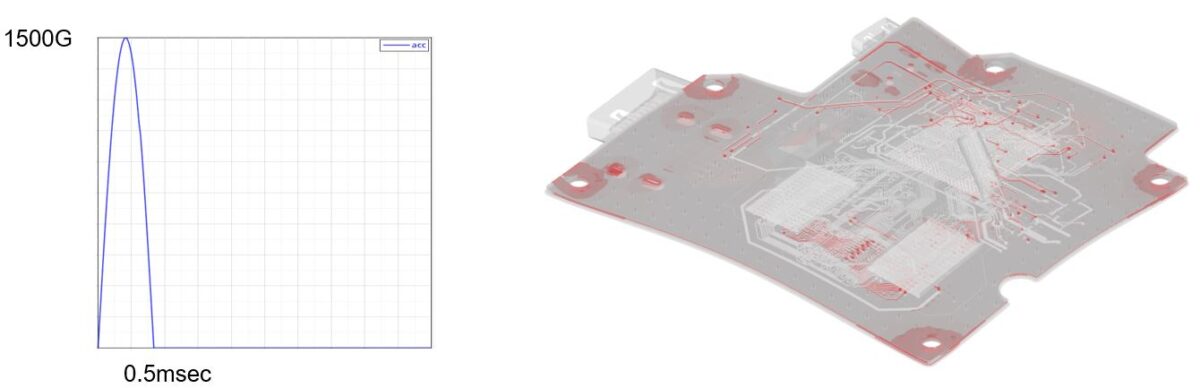 Baskılı devre kartları için (JESD22-B111) şok test standardında tanımlanan şok ivmesi (maks. 1500G) uygulanır. Delaminasyon bölgesini tahmin etmek için yükleme başlangıcından itibaren 3 msn’ye kadar analiz yapılır.