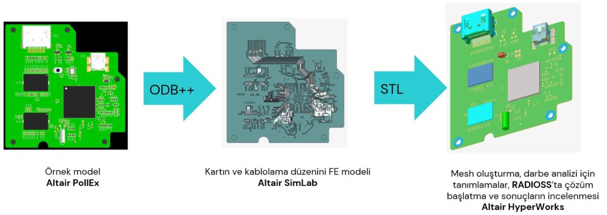 Bu örnekte, Altair PollEx‘in örnek PCB modeline dayalı olarak darbe analizi için bir model oluşturulmuş ve analiz Altair RADIOSS explicit dinamik çözücüde gerçekleştirilmiştir.