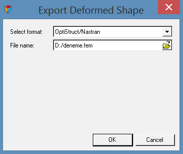 3- ) File –> Export –> Solver Deck seçimiyle (Ctrl+ E) Export Deformed Shape penceresini açınız. Altair OptiStruct (*.fem), Altair RADIOSS (*.RAD) , *.inp, *.key veya STL formatında modeli dışarı aktarınız (export)