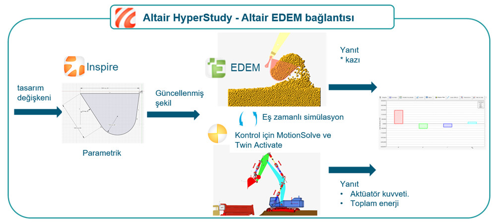 - Ekskavatörün, parçacık doldurma hareketine yönelik eş zamanlı simülasyon için Altair MotionSolve – Altair EDEM ( Mekanik sistem simülasyonu & dökme malzeme simülasyonu)