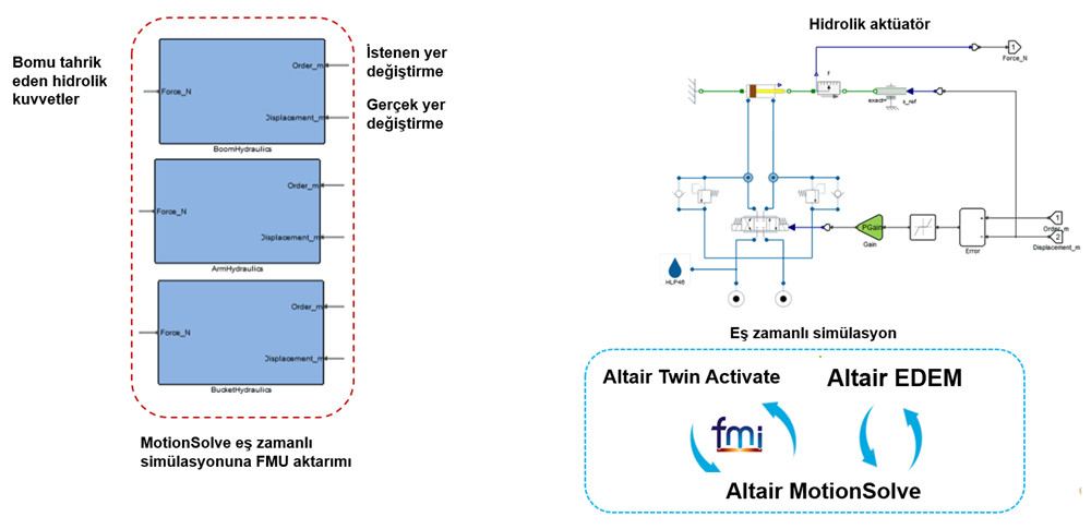 Altair MotionSolve, hareketli bir makinenin, bu durumda bir ekskavatörün dinamik davranışını simüle etmenizi sağlayan mekanik sistem simülasyon yazılımıdır. Esnek modellenen parçalarla elastik deformasyon da dikkate alınabilir. Böylece, kazı işlemi sırasında kol ve bom üzerindeki gerilme ve deformasyonu değerlendirmek mümkündür. 1D simülasyon yazılımı Altair Twin Activate ile birlikte hidrolik aktüatörler ve kontrol sistemleri de entegre edilerek tam sistem simülasyonu gerçekleştirilebilir.