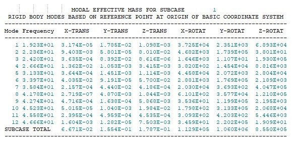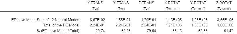 Görüldüğü gibi Altair OptiStruct, belirli bir rijit gövde DOF’unda çıkarılan tüm doğal modların etkin kütle toplamını sunar. Mühendisler her bir toplamı modelin toplam kütlesi ve toplam atalet momenti ile karşılaştıracaktır. İyi bir uygulama, tüm DOF’lardaki etkin kütlenin %80’inin hareketin iyi bir yaklaşımına yol açacağını düşünmektir. Bu örnekte 12 doğal mod çıkarılmıştır: