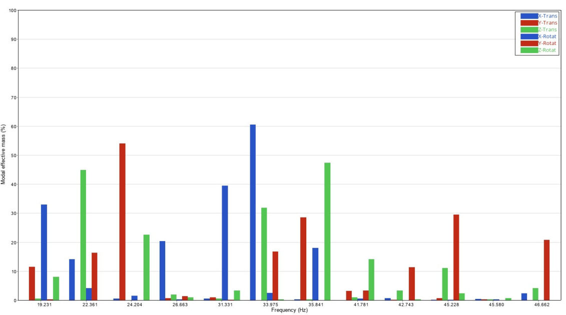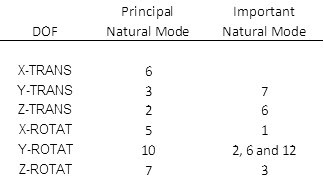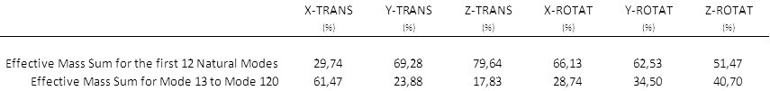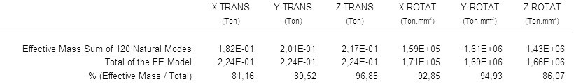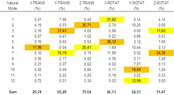Turuncu renkle vurgulanan değerler, her bir DOF için en yüksek etkin kütleye sahip doğal modları belirtir. Bunlar söz konusu DOF için ana modlar olarak kabul edilebilir. Sarı ile vurgulanan değerler, belirli bir DOF için yüksek etkin kütleye sahip doğal modlardır. Bunlar önemli modlardır.