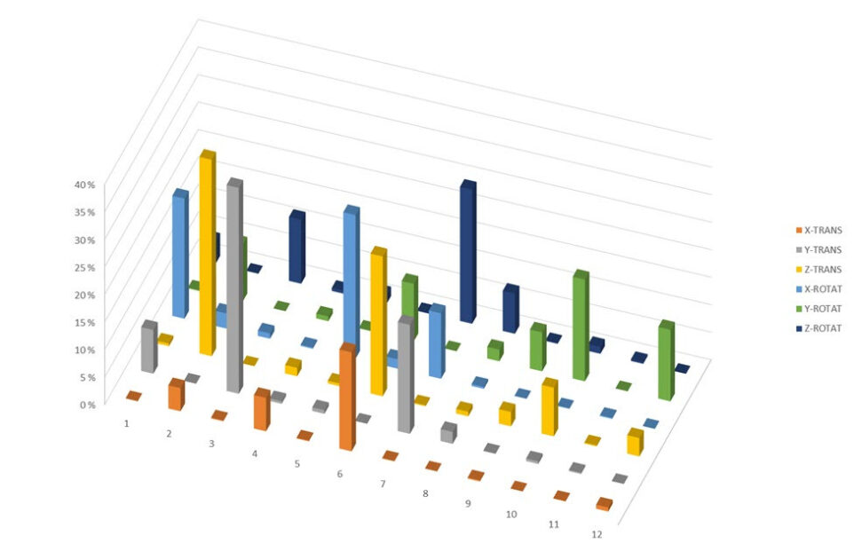 Çoğu DOF için, etkin kütlenin %50’sinden fazlası ilk 12 doğal modda yoğunlaşmıştır. Bunun istisnası sadece X-TRANS’tır. Bu nedenle, sadece ilk 12 doğal modu göstermeye devam edelim.
