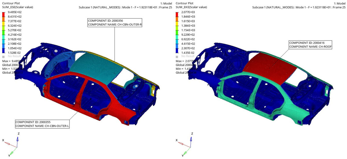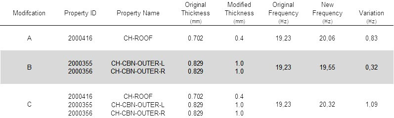 Bir doğal modun frekansını yükseltmek için, yüksek gerinim enerjisine sahip parçaların sertliğini artırabilir veya en yüksek kinetik enerjiye sahip parçaların kütlesi azaltılabilir. Bu örnekte, yan gövdenin sertliğini artırabilir (CH-CBN-OUTER-L ve CH-CBN-OUTER-R) veya tavanın kütlesini azaltabilir (CH-ROOF). Her iki modifikasyonu da gerçekleştirelim ve frekansları karşılaştıralım: