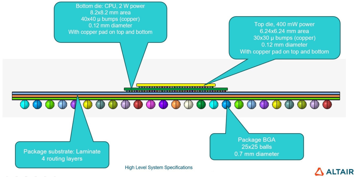 Çoklu fizik bir Elektronik Tasarım Otomasyonu (EDA) çözümü olan Altair® SimLab®, mühendislere termal endişelerle başa çıkma imkanı sunar. EDA çözümü, her bir yonganın boyutu, mikro bump sayısı, paket boyutları, katman sayısı, BGA konfigürasyonu ve her bir yonganın güç tüketimi gibi yüksek seviyeli özelliklerden yararlanarak sıfırdan bir 3D IC sistemi oluşturabilir ve termal açıdan zemin planını doğrulamak için titiz “what-if” analizleri gerçekleştirebilir.