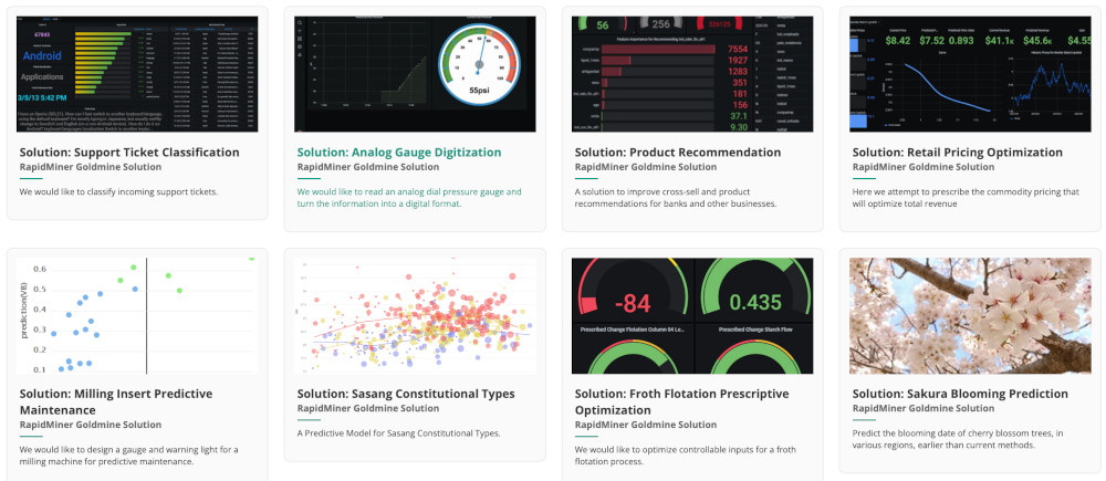 Bazılarınız Altair RapidMiner Goldmines’in farkında olmayabilir. Bunlar, başkalarının belirli veri bilimi zorluklarını nasıl çözdüğüne derinlemesine bakmanın harika bir yoludur. Tamamen belgelenmiş bu örnekler, gerçek dünyada karşılaşılan tüm karmaşıklıkları ve zorlukları içerir ve veri biliminin iş uygulamaları için tam olarak nasıl kullanıldığını keşfetmek için harika bir başlangıç noktası sağlar. Sertifikasyon için kendi çözümünüzü gönderebilir ve başkalarıyla paylaşabilirsiniz. Ayrıca başkalarının gönderdiği çözümlerden de bir şeyler öğrenebilirsiniz.