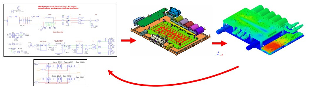 Bu 1D görünümü tamamlamak için 3D simülasyonlar eklenebilir ve birleştirilebilir, böylece dönüştürücüdeki sıcaklık dağılımı ve performans üzerindeki etkisi hakkında daha da kesin bir bilgi elde edilebilir. Altair PSIM‘de hesaplanan cihazların güç kaybı bilgileri ve bunların sıcaklığa bağımlılığı, baralardan gelen kayıpların da dahil edilebileceği 3D analizi gerçekleştirecek olan Altair SimLab‘e (çoklu fizik modelleme ve çözüm yazılımı) gönderilebilir. Simülasyon aynı zamanda CFD kullanarak dönüştürücünün soğutma sisteminin etkisini de içermektedir. Böylesine derin bir kavrayış, soğutucuların tasarlanmasına ve soğutma sıvısının akış hızı gibi temel parametrelere karar verilmesine büyük ölçüde yardımcı olur.