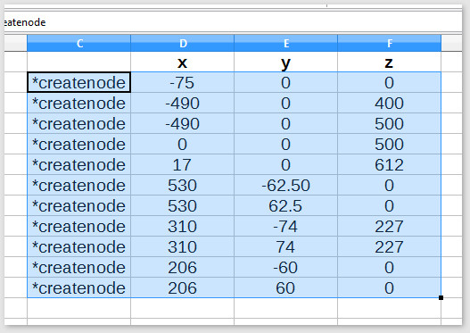 2-) X koordinat bilgisi yer alan sütünun soluna yeni bir sütün ekleyin. İlk satıra *createnode yazarak diğer satırlara kopyalayın. Ardından tüm satır ve sütünları seçerek kopyalama (ctrl+c) işlemini gerçekleştirin.