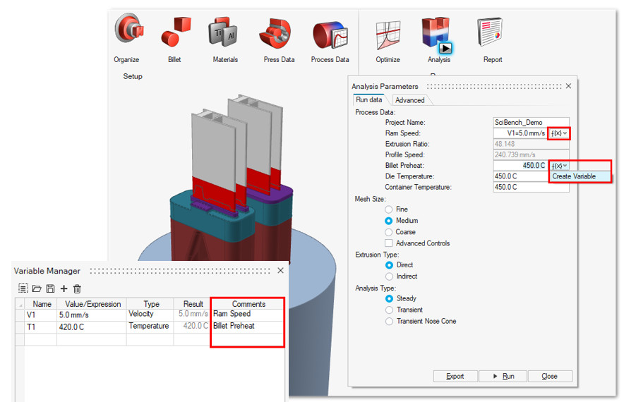 Bu versiyonda metal ekstrüzyon uygulamasında sadece Ram Speed ve Billet Preheat değişkenleri resmi olarak desteklenmektedir. Geometri ve diğer proses parametrelerine yönelik kapsamlı destek, ilerleyen versiyonlarda sunulacaktır. - Kalıp Gerilme Analizi