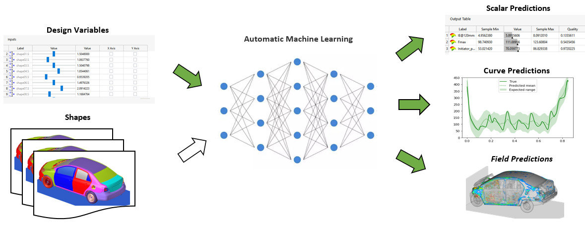 Veri biliminin simülasyon verilerine uygulanması yeni değildir, ancak son yıllarda benzeri görülmemiş bir ilgi görmüştür. Bilgisayar deneylerinin tasarımı ve analizi, kökleri deney tasarımı (DOE) ve yanıt yüzeyi modellemesine dayanan başlı başına bir alt konudur. Sonuçta yanıt yüzeyleri, tasarım değişkenlerinden skaler çıktıları tahmin etmek için kullanılan başka bir tahmin modelidir; çoğu zaman basitçe sıradan bir en küçük kareler regresyonudur. Birkaç yıl önce Altair, tüm yapıdaki davranışı görselleştirmek için Design Explorer‘da alan tahminleri sunmuştu. Peki ya bulmacanın son parçası? Eğrileri tahmin etmek de önemlidir. Birçok durumda mühendisler, örneğin bir araba çarpışmasındaki kuvvetler veya yatan bir koltuk mekanizmasının direnci gibi, önerilen bir tasarımın değerini değerlendirmek için eğrileri yorumlarlar. Altair HyperStudy yakın zamanda birçok mühendislik uygulamasında faydalı olacak vektörleri tahmin etme teknolojisini piyasaya sundu.