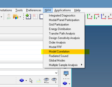 Test ve simülasyon sonuçlarını elde ettikten sonra Altair HyperView yazılımını açınız. NVH menüsünden Model Correlation seçimini gerçekleştiriniz. ( NVH menüsünü aktif hale getirmek için File –>Load –> Preference File penceresinden “NVH Utilities” seçimini ( Load ) gerçekleştirmeniz gerekmektedir.)