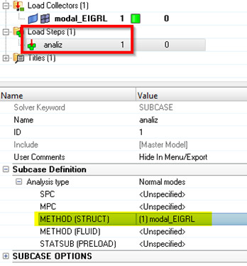 Sonraki adım doğal frekans analiz tanımlamasını (load step) gerçekleştirmek ve Analysis –> OptiStruct panelinden çözümü başlatmaktır.