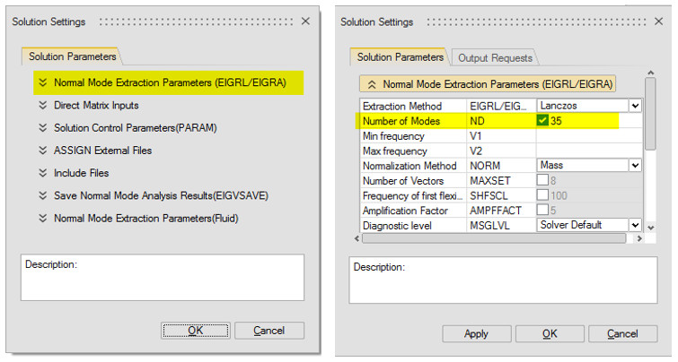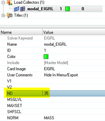 Hesaplanacak mod sayısını ND bölümüne yazmanız yeterli olacaktır. Örneğin 35 yazdığımızda sabitlenmeyen modelde (free-free) hesaplama sonucunda ilk 6 mod rijit modlar olacaktır ve sonraki 29 mod korelasyon için ilgileneceğimiz modlar olacaktır.