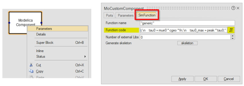 Doğrudan Modelica dilini kullanarak bir model oluşturmak isterseniz, aşağıda gösterilen Modelica Component bloğunu kullanabilirsiniz.