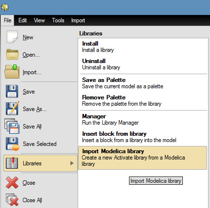 Modelica Standard Library (MSL) versiyon 3.2.2 kullanılarak geliştirilen Modelica kütüphanelerini File–> Libraries–> Import Modelica library yolunu takip ederek solidThinking Activate yazılımına ekleyebilirsiniz.