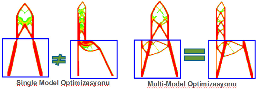 Sağ bölümde ise multi-model optimizasyonu sonucu eş zamanlı gerçekleştirilen optimizasyon çözümü sonucu elde edilen konsept tasarım yer almakta. Açıkca görülebileceği gibi bu çözümde elde edilen konsept tasarım her iki montaj parçada ortak olarak kullanılabilecek bir şekle sahiptir.