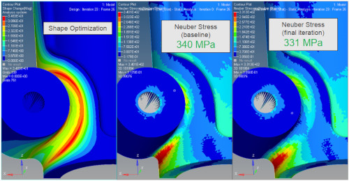 NEUBER yöntemini yapısal optimizasyon analizlerinde de kullanabilirsiniz. Gerilmeyi azaltmak için STRESS ve STRAIN cevap fonksiyonlarını kullanarak şekil (shape) optimizasyonu gerçekleştirebilirsiniz.