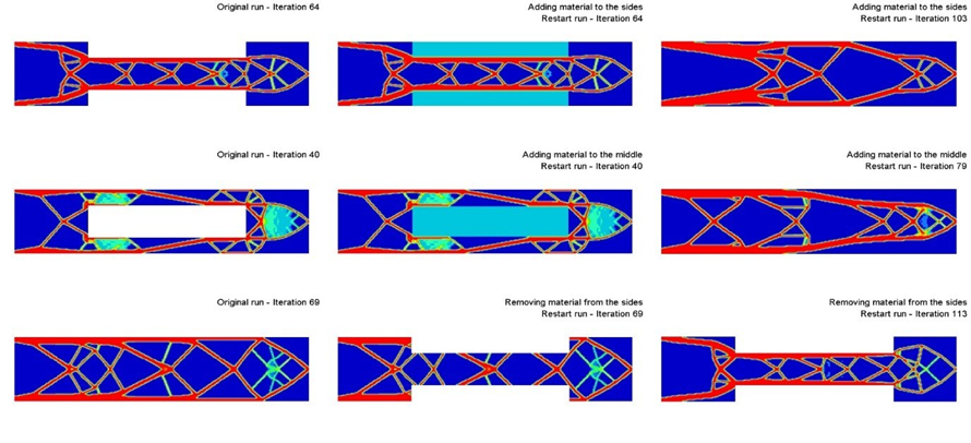 Optimizasyon çalışmalarında restart işlemini kullanmak için DOPTPRM, TOPDV, ALT kartı kullanılmaktadır. Optimizasyon çalışmasını istediğimiz adımda durdurup, tasarım alanında değişiklikler yaptıktan sonra DOPTPRM, TOPRST, ADVERNOM kartını tanımlayarak tekrar çözüme başladığımızda tasarım alanında yaptığımız değişiklikler optimizasyon çalışmasına dahil edilerek en son iterasyondan çözüm devam edecektir.