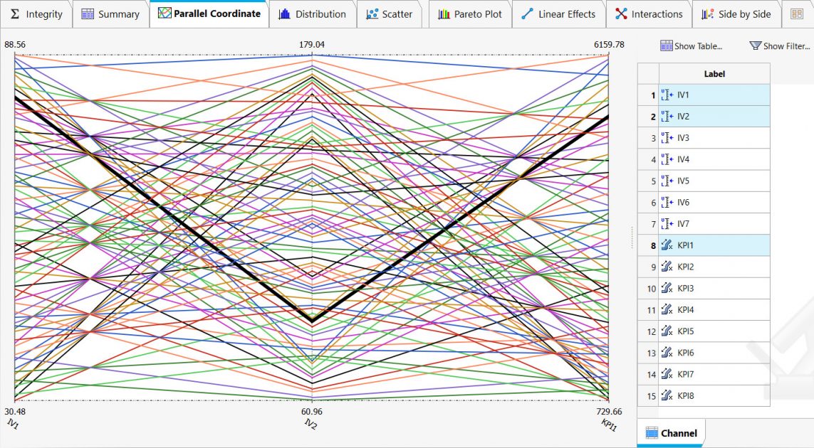 Örneğin IV1, ekran görüntüsündeki ilk değişken kanaldır. Grafiğin en solunda yer alan bu değişken, dikey eksenin altındaki minimum 30.48 değerinden üstte maksimum 88.56 değerine kadar değişir. İkinci kanal IV2, 60.96 ile 179.04 arasında değişmektedir. Bu tür bir çizim iki boyutta bile işe yarayabilir, ancak birçok boyutta iyi ölçeklenir – teorik olarak sınırsızdır! Verileri araştırmak için kullanıldığında, paralel koordinat grafiğinin iyi bir uygulaması, kullanıcının görüntülenen kanalları etkileşimli olarak değiştirmesine izin vermelidir. Yukarıdaki ekran görüntüsünde, bu sağ taraftaki kanal seçici tarafından kontrol edilmektedir. Aşağıdaki ekran görüntüsü, yalnızca 1., 2. ve 8. kanallar seçilerek temsil edilen aynı verileri göstermektedir.