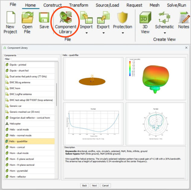 Modellerin yer aldığı kütüphane, CADFEKO arayüzünde Home şeridinde mevcuttur ve kullanmak için ek lisans gerektirmez. Bir filtre ile farklı anten tiplerini arayabilir ve uygun modeli seçebilirsiniz. Bileşen özellikleri bir önizleme penceresinde görselleştirilecektir.