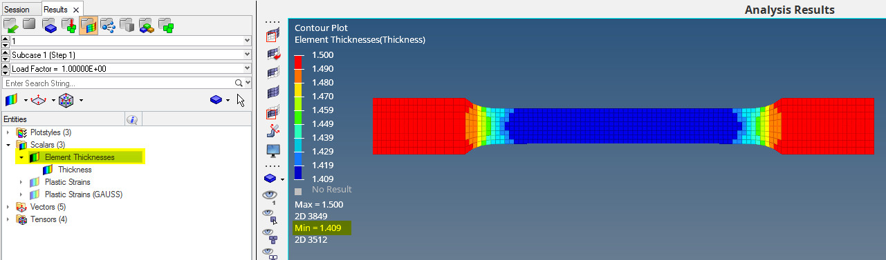 Altair OptiStruct 2019 versiyonuyla birlikte shell eleman içeren modellerin large displacement analizi (NLSTAT & NLTRANS) sonucunda kalınlık değişimini görebilirsiniz. Özellikle boyun verme tipi uygulamalarda shell elemanların kalınlığının ne kadar azaldığını veya artığını görmek açısından bu özellik kullanıcılar için oldukça faydalı olacaktır.