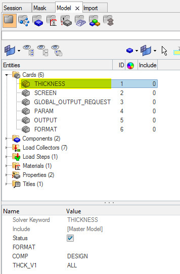 Sonuç dosyasına kalınlık bilgisinin yazılabilmesi için Altair HyperMesh‘de hazırlanan modelde , THICKNESS kartını açmanız gerekmektedir. ( İpucu : Ctrl+ F tuşlarına basıp THICKNESS yazarak kısa yoldan output isteğini oluşturabilirsiniz.)