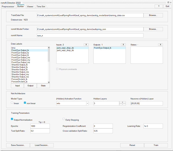 Sisteme toplam 3 giriş ve sistemden 9 çıkış bulunmaktadır. Eğitim veri setini oluşturmak için Altair MotionSolve‘da yaprak yay test düzeneğini kullanıyoruz ve aksı/krikoyu X, Y ve Z yönünde hareket ettirerek birkaç test gerçekleştiriyoruz. Yaptığınız testlerin gerçek dünya senaryosunu (tek şerit değiştirme, sabit yarıçap, düz hat frenleme vb. manevralar sırasında dingil hareketini düşünün)içerdiğinden emin olun çünkü bu senaryolar üzerinde eğitilen ML modeli görmediği sonucu üretemez.