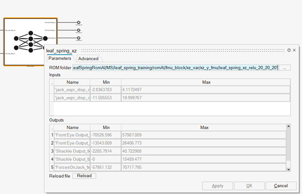 1-) Eğitim veri setinde yaprak yay ROM’unun tahminlerini test edin ( Altair Activate‘de csv bloğunu kullanın ). Süper bloğun sonuçları çıkışlara yakınsa, ikinci testimiz için MotionSolve içinde kullanılmak üzere bu yaprak yay ROM’unun bir FMU’sunu oluşturabiliriz.