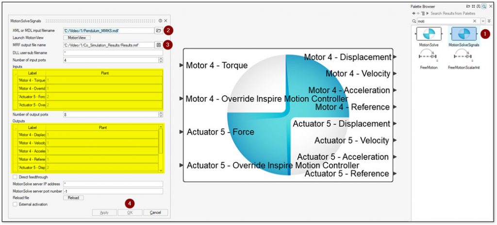 - Altair Activate yazılımında bu parametrelere erişim sağlayabilmek için eş zamanlı simülasyon bloğu olan MotionSolveSignals bloğunu sürükle bırak yöntemi ile tasarım ekranına taşıyınız. [1]