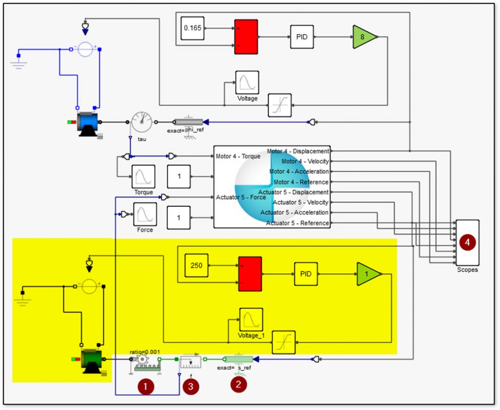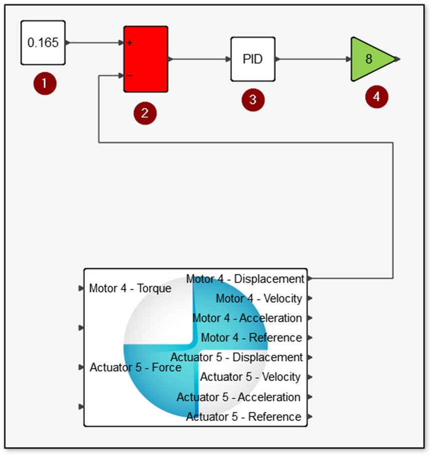 Yapı üzerinde doğrusal hareket bir adet kart vasıtasıyla sağlanmaktadır. Bu kartın doğrusal hareketini bir adet Aktüatör tanımlayarak Inspire içerisinde kontrol altına almıştık. Motor için oluşturulan PID denetleyici sistemi ve motor tanımlamaları aynı zamanda aktüatör içinde tanımlanacağı için aşağıdaki ekran görüntüsünde yer alan sarı pencere içerisindeki diagramları ilk sistem içerisinden çoğaltabilir, tekrardan uygun parametreler ile düzenleyebilirsiniz.