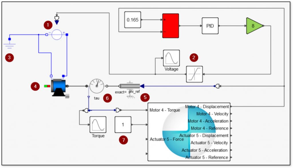 - 4. adımda oluşturulan DCMotor bloğu ile 5. adımda oluşturulan Position bloğunu tork sensörü (Torque Sensor) vasıtasıyla birbirine bağlayınız. Elde edilen tork değerini doğrudan MotionSolve bloğu üzerinde Motor 4 – Torque girdisine bağlayınız. [6]