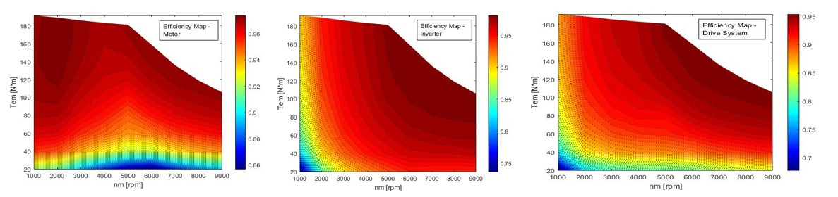 Elektrikli bir araçta kullanılan tipik bir çekiş makinesi (Daimi Mıknatıslı Senkron Makine) örneğini ele alalım. Tablolar Flux’tan çıkarılmış ve daha sonra PWM (Darbe Genişlik Modülasyonu) kontrolünü uyguladığımız PSIM‘de kullanılmıştır. Çalışma noktalarını değiştirmek için bazı komut dosyaları kullanma Şekil 2’de gösterildiği gibi motorun, invertörün ve tüm sürücünün verimlilik haritalarını elde etmek mümkündür.