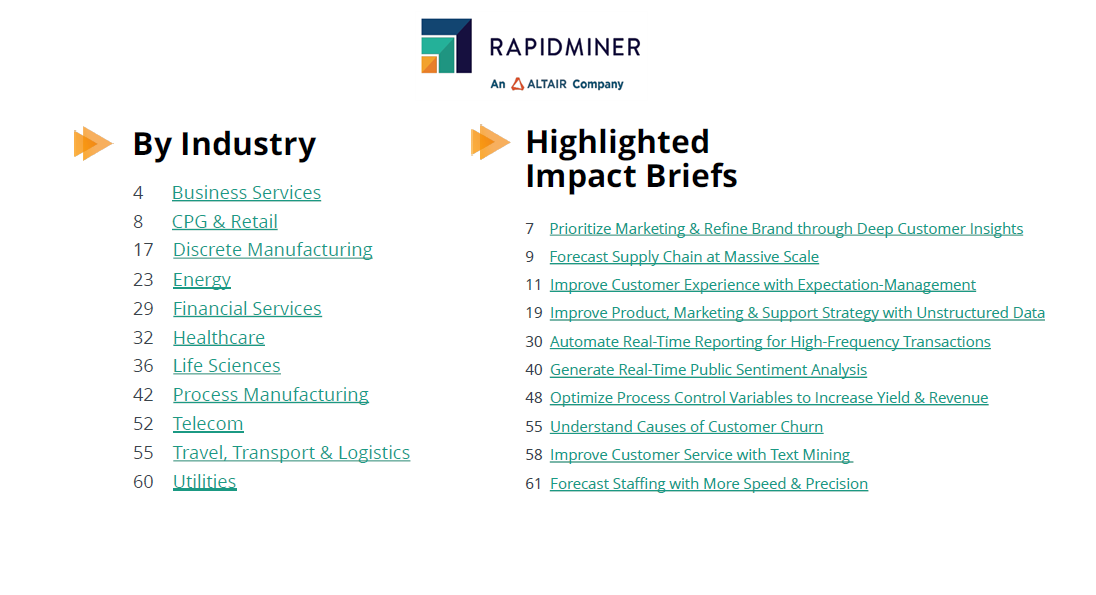 Klavuzdaki bölümler ‘Etki Özetleri’ olarak adlandırılmaktadır ve yapay zekanın Altair RapidMiner ile ilerlemeye nasıl yardımcı olduğunu gösteren gerçek vaka çalışmalarıdır. Bazıları rekabet avantajlarını korumak için anonimdir, bazıları ise müşterilerimizin ve ortaklarımızın onayı ile yayınlanmıştır. Ortak olan tek şey, tüm bu kullanım örneklerinin muazzam bir iş etkisine sahip olmasıdır. Birçoğu bariz bir şekilde geliri artırıyor, çoğu maliyetleri düşürüyor ve bazıları da riski azaltıyor. Bazı kullanım örnekleri çok spesifik bir sektörle ilgilidir ancak yine de aynı sektörde olmayan işletmeler için rehberlik sağlayabilir. Bunlar her bir kullanım örneğinde ‘evrensel uygunluk’ başlığı altında belirtilmiştir. İşletmeniz için hangi kullanım örneğini denemek ve çoğaltmak doğru olur? Tek yapmanız gereken en etkili ve ulaşılabilir görüneni seçmek, biraz veri bulmak ve başlamak.